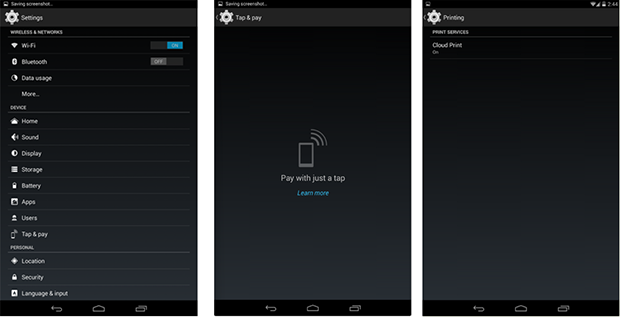 Màn hình setting của Android 4.4 có nhiều tùy chọn mới như Home, Tap & Pay (thanh toán qua NFC), Printing (in không dây),...