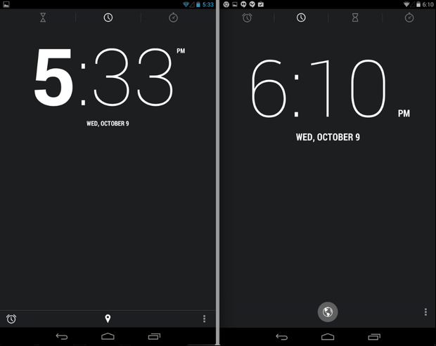 | Ứng dụng đồng hồ trên Android 4.4 bổ sung thêm một tab, font số thay đổi và bổ sung thêm nút giờ thế giới ở cuối màn hình. |