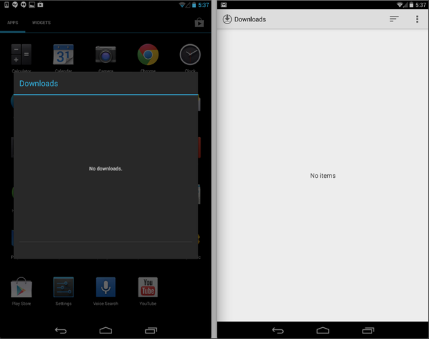 Ngoài những thay đổi về giao diện, Android 4.4 cũng hỗ trợ in không dây, thanh toán qua NFC,... dưới đây là những hình ảnh so sánh Android 4.4 (trái) và Android 4.4 (phải).