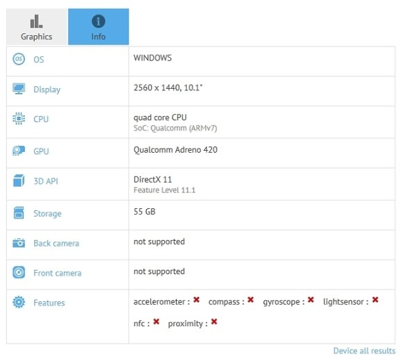 GFXBench - trang web sở hữu ứng dụng benchmark nổi tiếng cùng tên, vừa cung cấp một bản thông số kỹ thuật được cho là của mẫu máy tính bảng Lumia mới của hãng điện tử Phần Lan. Điểm đáng chú ý là dự kiến máy sẽ sở hữu màn hình 10,1 inch với độ phân giải QHD (2.560 x 1.440 pixel).