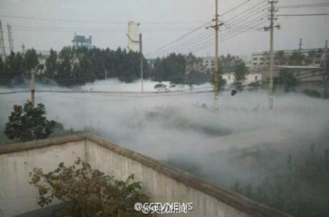 | Sương trắng xuất hiện sau vụ rò rỉ hóa chất ammoniaở Hà Nam. Ảnh: CCTV |