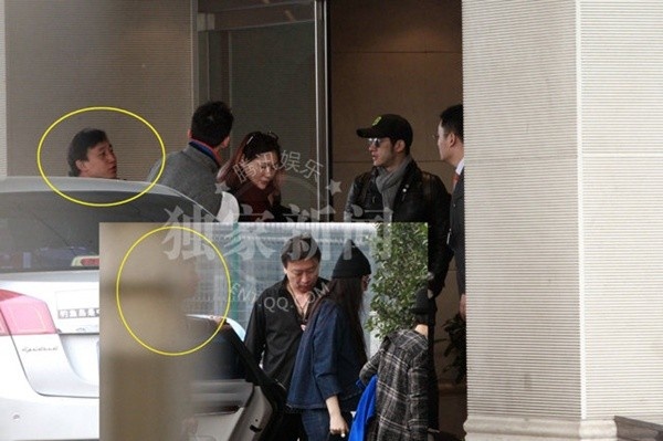 | Lý Trị Đình lộ diện sau Phạm Băng Băng. Quản lý của Trị Đình (khoanh vàng) theo sát cả Phạm Băng Băng và anh chàng. |
