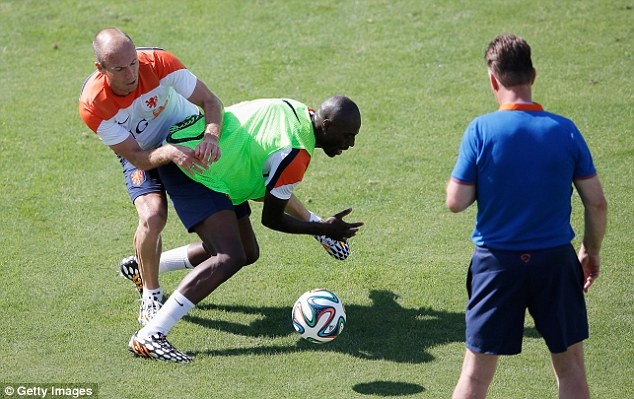 Không chịu nhịu nhường nhịn đàn em, Robben cũng tranh cướp bóng quyết liệt với Indi ngay trước mặt HLV Louis Van Gaal.