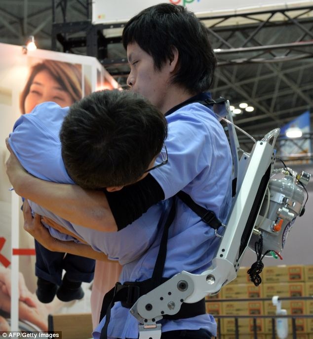 | Nhờ tác động của khí nén, Muscle Suit tăng thêm lực cho con người khi chúng ta bế bệnh nhân hoặc người già. Mục tiêu chính của triển lãm là giúp khách tham quan hình dung những công nghệ trợ giúp người già, người tàn tật trong tương lai. Ảnh: Getty Image. |