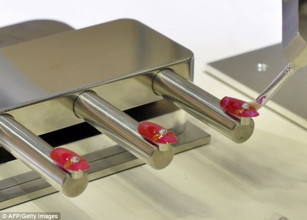 | "Robo Nailist", tên của robot làm móng, đang trình diễn khả năng sơn móng tay với độ chính xác rất cao. Ảnh: Getty Image. |