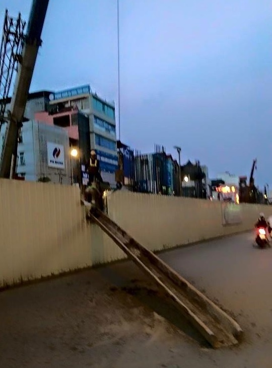 Cùng lúc, một người đàn ông khác chở theo hai con nhỏ phía sau đạp mạnh chân phanh khiến xe trượt một đoạn tới sát trước thanh dầm. Nhiều công nhân vội vã chạy ra đường, dùng cáp móc vào đầu thanh dầm cẩu vào bên trong.