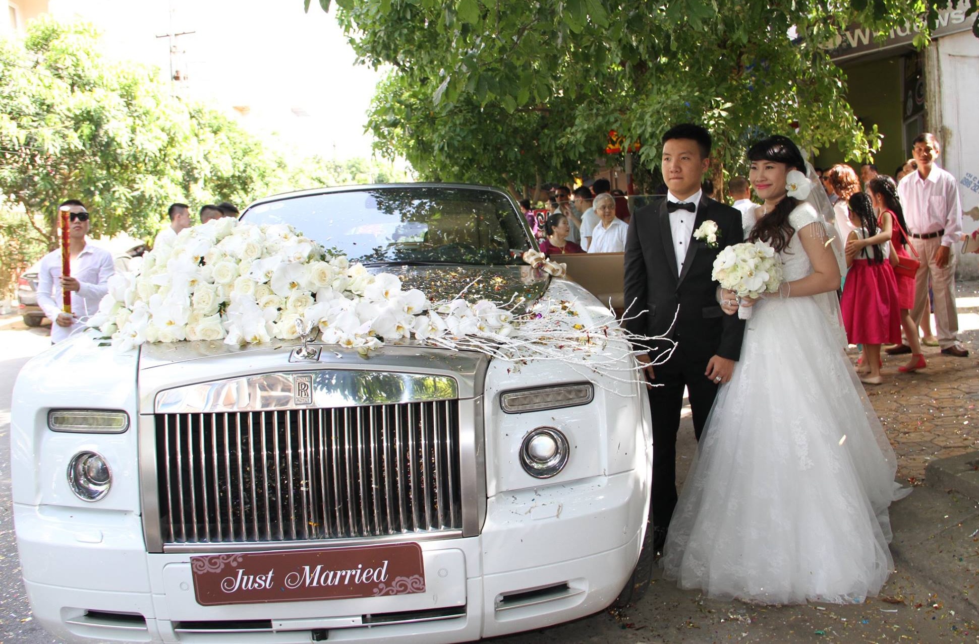 | Cô dâu chú rể chụp ảnh bên chiếc xe hoa Rolls-Royce mui trần. |