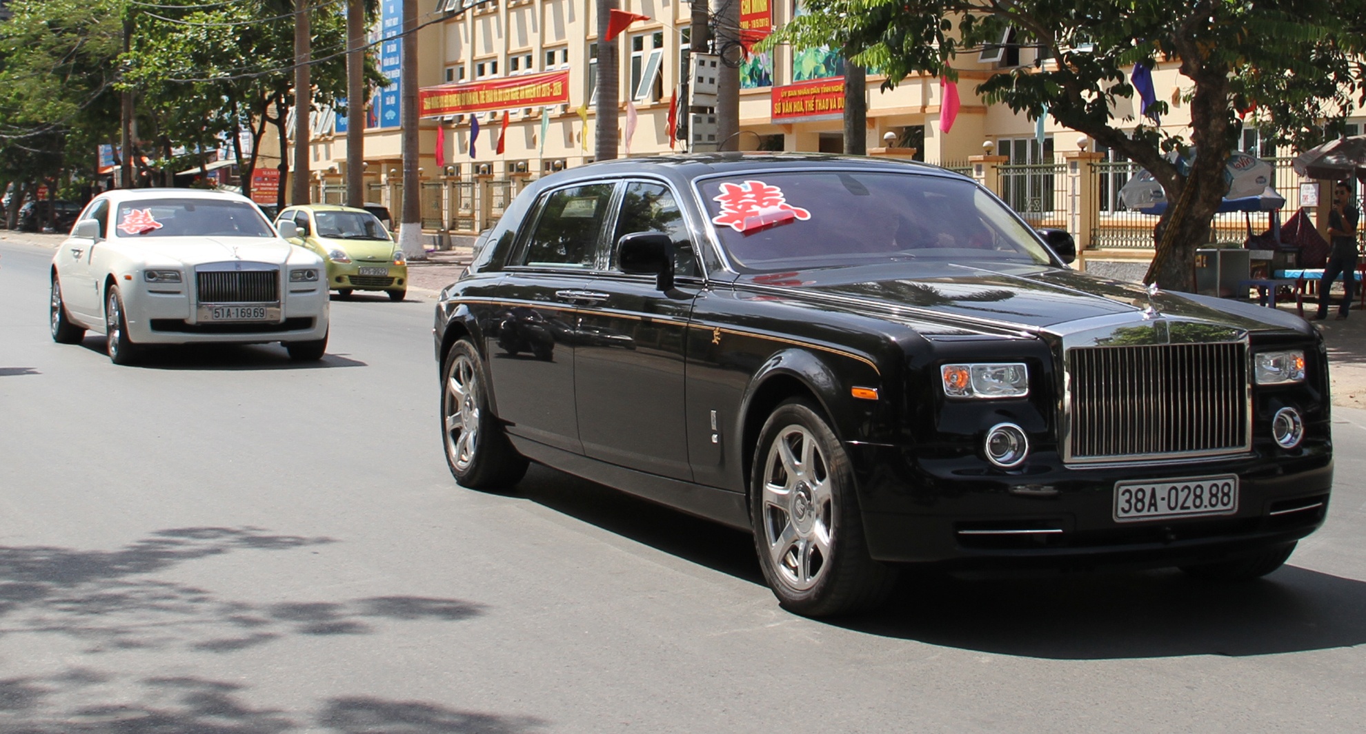 | Rolls-Royce Phantom in hình rồng của đại gia Hà Tĩnh cũng xuất hiện trong đoàn, phía sau là một chiếc Rolls-Royce Ghost màu trắng. |