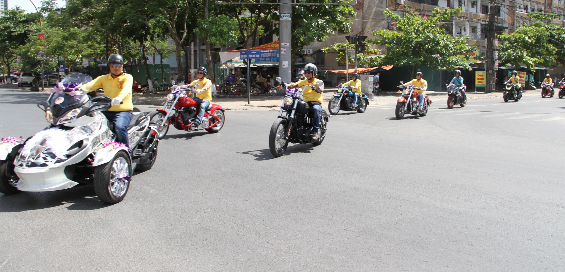 | Dàn môtô phân khối lớn gồm các mẫu Harley-Davidson, bên cạnh loạt Kawasaki Z1000 hay Suzuki B-King. Đây là xe của các thành viên câu lạc bộ môtô thể thao Nghệ An. Trước khi đám cưới diễn ra, các thành viên đã có buổi gặp gỡ, bàn bạc kế hoạch đưa đón dâu cụ thể. |