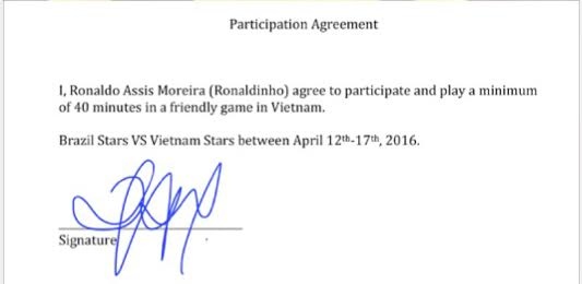 | Ronaldinho ký xác nhận sẽ tham dự trận đấu giao hữu tại Việt Nam tháng 4 tới. |