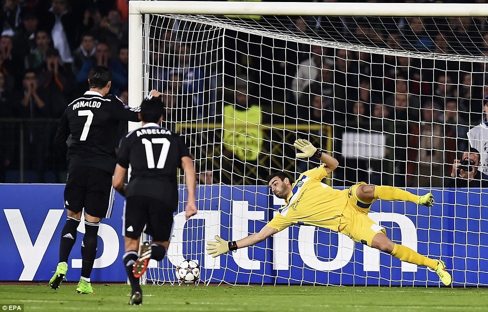 | Tuy nhiên, Ronaldo nhanh chóng sửa lỗi ở phút 24 khi buộc hậu vệ chủ nhà phạm lỗi trong vòng cấm và một lần nữa đem về cho Real quả phạt đền. Lần dứt điểm này, CR7 không cho Stoyanov cơ hội cản phá. |