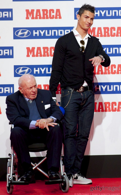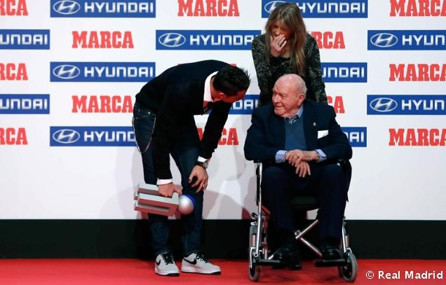 | Ronaldo được trực tiếp Di Stefano trao cúp. |