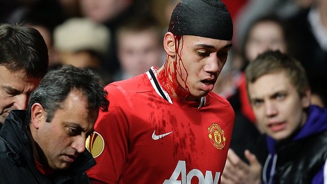 | Trung vệ trẻ Chris Smalling từng phải rời sân với chiếc băng quấn vết thương ở đầu trong trận đấu giữa M.U và Atheltic Bilbao diễn ra trên sân Old Trafford. |