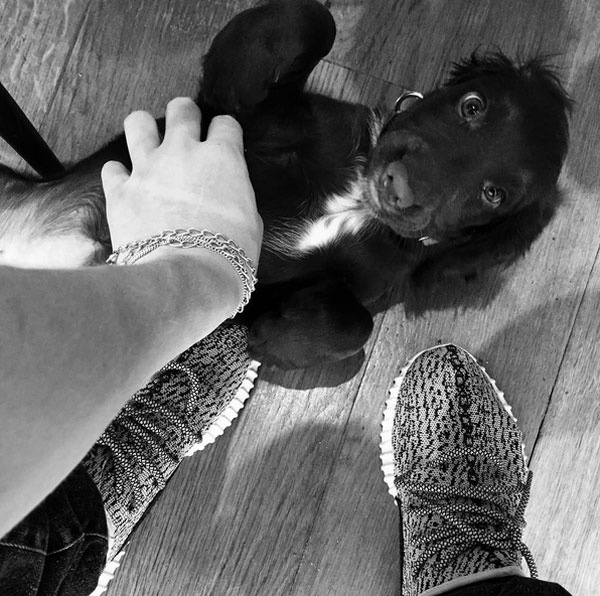 | Brooklyn Beckham thích thú đùa nghịch cùng chú cún cưng. |
