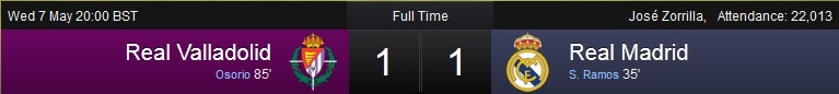 Tuy nhiên, một thoáng mất tập trung của các hậu vệ ở phút 86 khiến Real phải trả giá bằng bàn gỡ hòa 1-1. Từ cú đá phạt góc bên cánh phải, Javi Guerra bật cao đưa bóng vào góc xa khiến nỗ lực cản phá của Iker Casillas trở nên vô nghĩa. Những phút còn lại, đội thị vệ Hoàng gia tràn lên dữ dội. Nhưng cũng giống như trận gặp Valencia cuối tuần qua, các chân sút của Real đã bất lực để rồi chấp nhận ra về với 1 điểm trong tay.