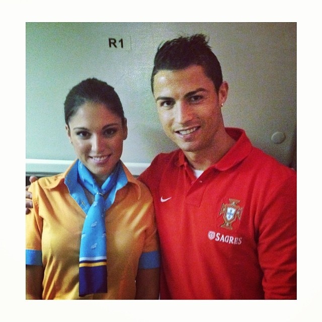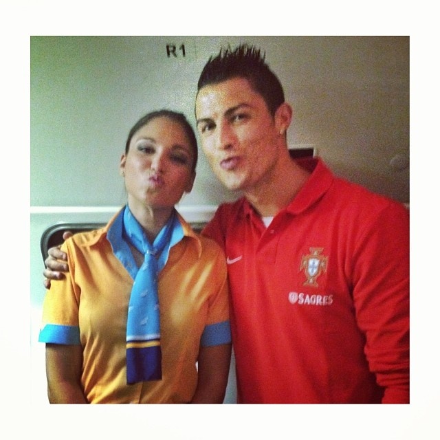 Trên chuyến bay sang Stockholm để chuẩn bị thi đấu lượt về vòng playoff World Cup 2014 gặp đội chủ nhà Thụy Điển, C.Ronaldo vui vẻ chụp hình làm kỷ niệm cùng một nữ tiếp viên hàng không. Anh thậm chí còn chu môi tạo dáng xì-tin với tiếp viên xinh đẹp này. |