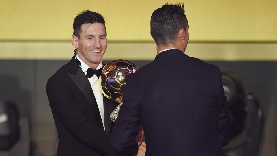 | Cristiano Ronaldo chúc mừng tân chủ nhân Quả bóng vàng. Siêu sao người Bồ Đào Nha không tỏ ra buồn bã dù chưa thể quân bình thành tích của El Pulga. |