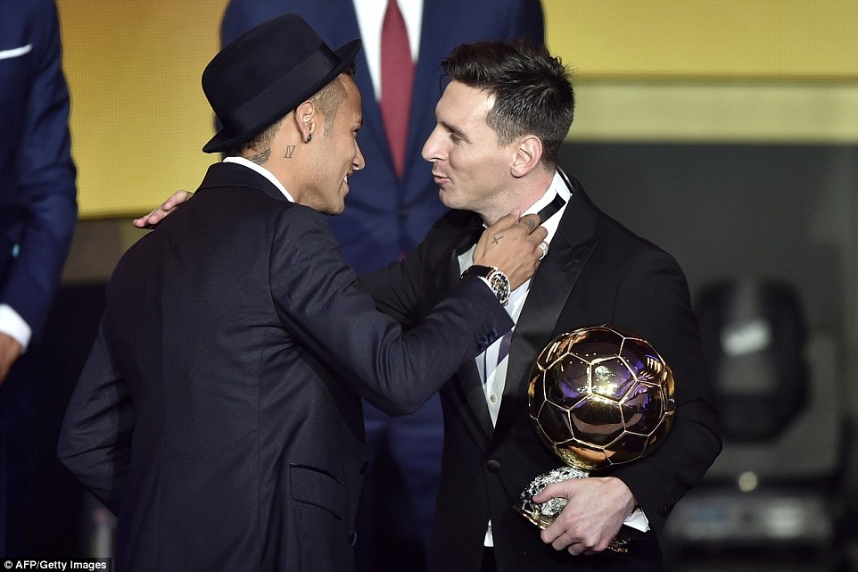 | Neymar chúc mừng đàn anh ở Barcelona. Đây là lần đầu tiên chân sút người Brazil có tên trong danh sách rút gọn. Trong khi Messi có tới 9 lần liên tiếp. |