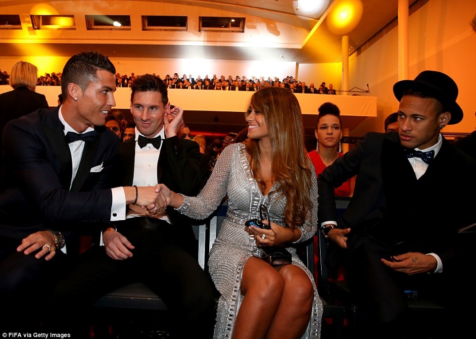 Ronaldo vui vẻ chúc mừng Messi và bắt tay bạn gái của siêu sao người Argentina nằm trong những hình ảnh đẹp tại sự kiện trao giải Quả bóng vàng FIFA ở Zurich, Thụy Sỹ.