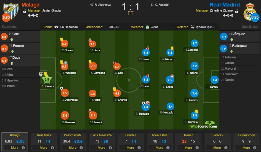 Không có được sự phục vụ của bộ đôi Karim Benzema và Gareth Bale vì chấn thương, Real hành quân tới hiểm địa La Rosaleda với kỳ vọng rất lớn đặt lên đôi vai Cristiano Ronaldo, ngôi sao sở hữu phong độ ấn tượng thời gian gần đây. Đáp lại, chân sút người Bồ Đào Nha trực tiếp mang về bàn thắng mở tỷ số ở phút 33 dù các trọng tài bỏ qua lỗi việt vị. Nhưng chừng đó vẫn không thể cứu vãn một buổi chiều đáng quên với cá nhân CR7 và Real.