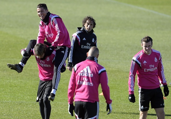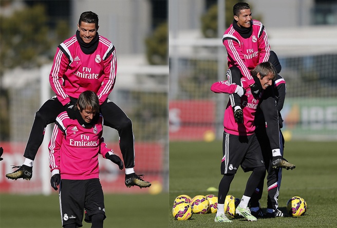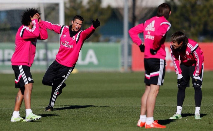| Màn ăn mừng của CR7 khiến không khí buổi tập luyện của Real thêm phần vui vẻ. |