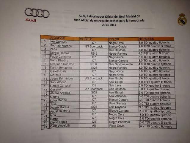 Danh sách 24 cầu thủ được nhận xe Audi mùa 2013-2014. CR7 được tặng Audi RS 6, Ramos được tặng xe Audi RS 5, Ancelotti được nhận A8, Bale, Casillas được tặng Q7...