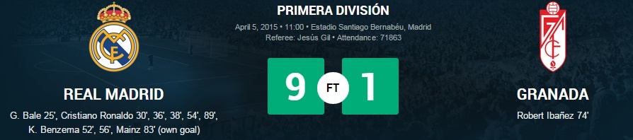 Cristiano Ronaldo vừa trải qua trận đấu thăng hoa nhất trong năm 2015. Trước hàng phòng ngự thiếu chắc chắn của Granada, siêu sao người Bồ Đào Nha ghi 5 bàn, góp phần vào chiến thắng thuyết phục nhất của Real kể từ đầu giải. Với 3 điểm giành được từ Granada, Real tạm thu hẹp khoảng cách với Barca xuống còn 1 điểm trong cuộc đua tới ngôi vô địch La Liga mùa này.