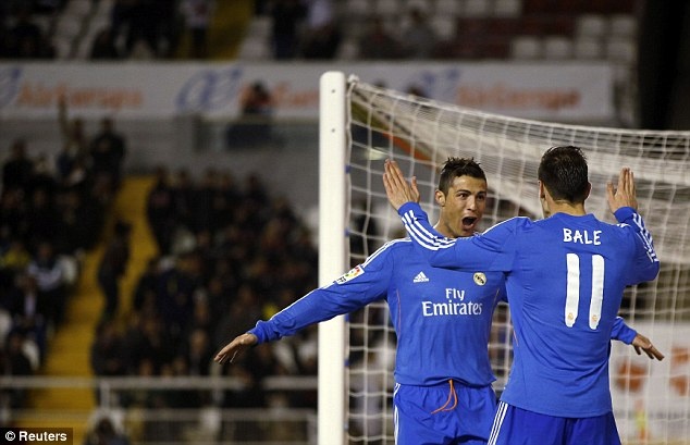 | Ronaldo chia vui cùng Gareth Bale sau khi có bàn thắng thứ 13 sau 12 trận ở La Liga mùa này. |