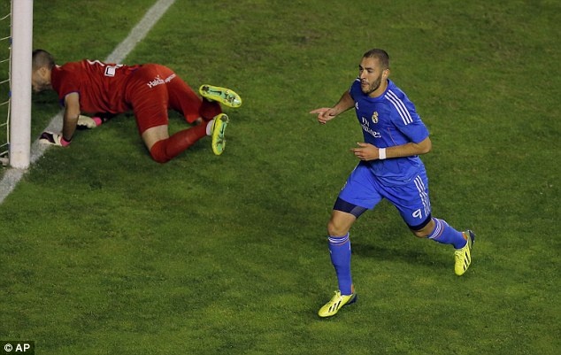 | Benzema nâng tỷ số lên 2-0 cho Real sau pha dứt điểm từ đường chuyền bên cánh phải của Gareth Bale. |