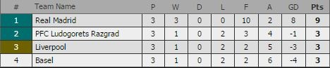| Chiến thắng 3-0 giúp đoàn quân của HLV Ancelotti xây chắc ngôi đầu với 9 điểm tuyệt đối và gần như sẽ giành tấm vé đầu bảng B. Trong khi, Liverpool vẫn khá may mắn bởi ở trận đấu cùng giờ, Basel bất ngờ gục ngã trên sân của Ludogorets. Như vậy, The Kop vẫn còn rất nhiều cơ hội giành vé đi tiếp khi hiện có cùng 3 điểm với Basel và Ludogorets. |