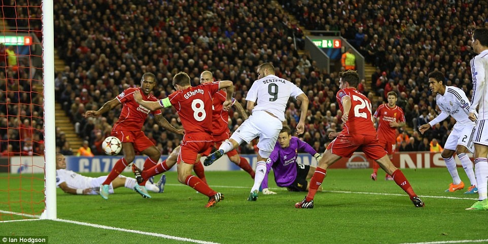 | 7 phút sau bàn thua đầu tiên, sân Anfield tiếp tục nín lặng khi Benzema có pha đánh đầu cầu âu đẹp mắt không cho Mignolet một cơ hội cản phá. |