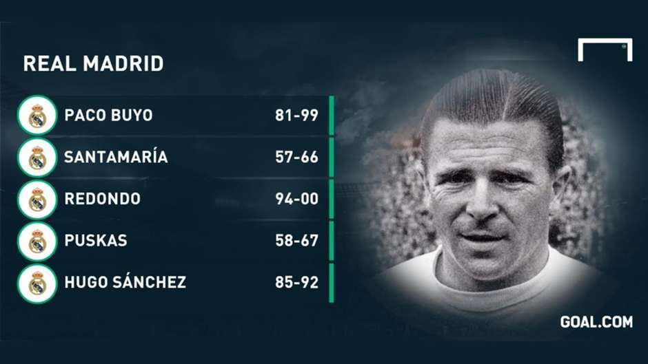 | Alfredo Di Stefano chính là linh hồn của Real Madrid trong thời kỳ hoàng kim ở những năm 50-60 của thế kỷ trước. Huyền thoại từng chơi bóng cho cả ĐT Argentina lẫn Tây Ban Nha, cùng "Kền kền trắng" 8 lần đăng quang La Liga và giành 5 chức vô địch cúp C1 liên tiếp, từ 1956 đến 1960. Di Stefano đóng góp 216 bàn thắng cho đội bóng Hoàng gia sau 284 lần ra sân. |