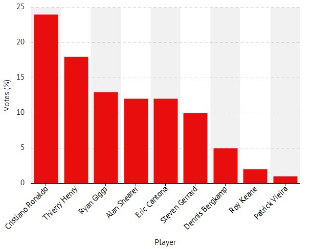 Trong cuộc bầu chọn “Cầu thủ xuất sắc nhất lịch sử Premier League” được tổ chức bởi Usurv - một website chuyên khảo sát dữ liệu và nghiên cứu thị trường, Cristiano Ronaldo đã vượt qua một loạt những huyền thoại từng chơi bóng tại đảo quốc sương mù như Thiery Henry, Ryan Giggs, Alan Shearer, Eric Cantona hay Steven Gerrard để trở thành người có số phiếu bình chọn nhiều nhất. Cụ thể, ngôi sao hiện khoác áo Real Madrid nhận 24% phiếu ủng hộ trong tổng số 1.000 người tham gia bầu chọn.