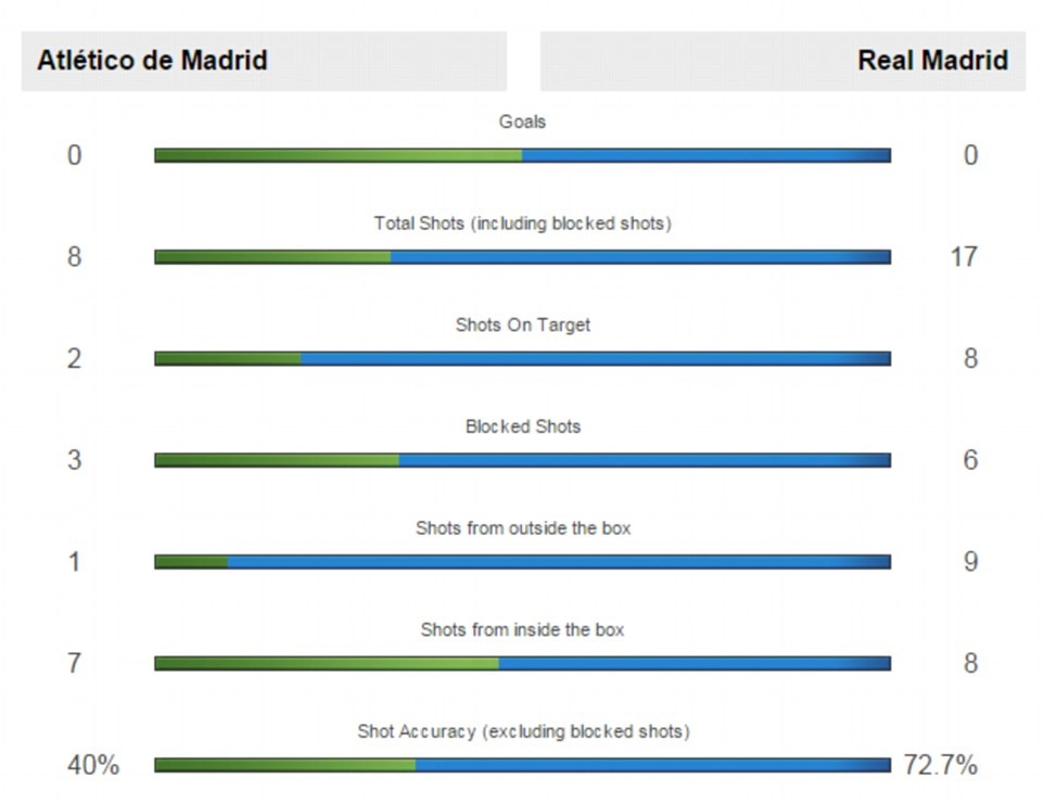 Trong 90 phút của trận tứ kết Champions League lượt đi diễn ra trên sân Vicente Calderon, Real tung ra 17 cú dứt điểm về phía cầu môn của Atletico.