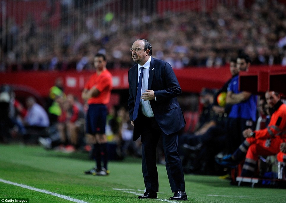 | HLV Benitez đứng lặng sau khi Real chịu cảnh trắng tay trên sân của Sevilla. |