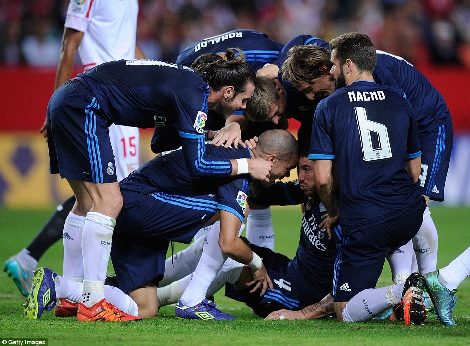 | Các đồng đội tới chia vui trong khi Ramos vẫn nhăn nhó vì bị đau. |