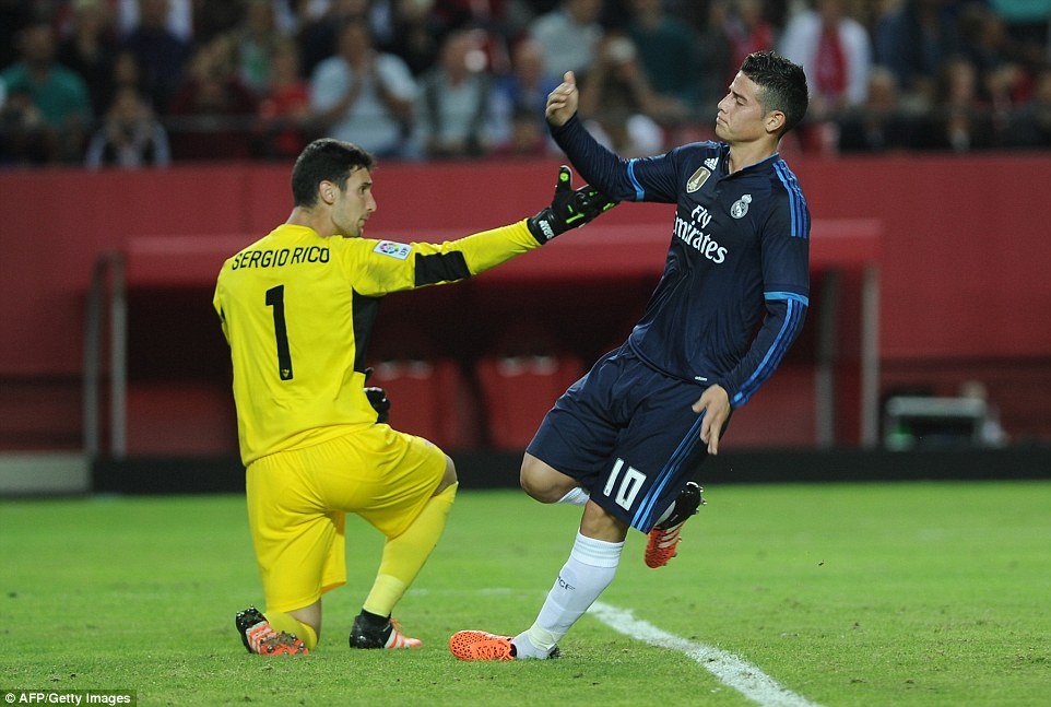 | Ramos bị đau sau khi sút tung lưới đội bóng cũ. Vai của anh nện thẳng xuống sân sau cú tung người móc bóng. |