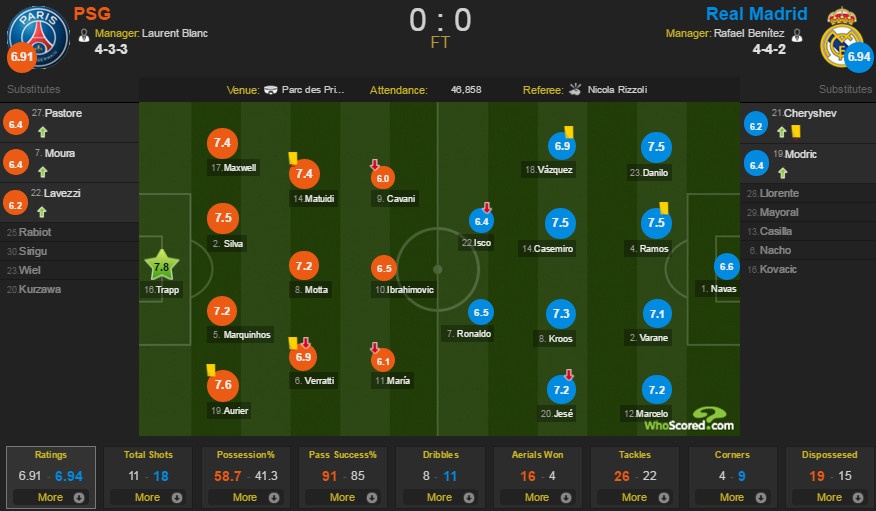 Bên cạnh phong độ chói sáng của thủ môn người Đức, PSG cũng thi đấu khởi sắc hơn trong hiệp 2. Đương kim vô địch nước Pháp tạo ra thế trận ngang ngửa và nếu may mắn hơn, đoàn quân của huấn luyện viên Laurent Blanc đã được hưởng một quả phạt đền ở phút 65. Sau cú sút của Di Maria, bóng chạm tay Marcelo trong vòng cấm Real nhưng trọng tài Rizzoli không thổi phạt đền.