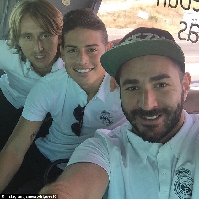Tiền vệ James Rodriguez cùng Benzema và Luka Modric chụp chung bức ảnh trên máy bay khi trở về Tây Ban Nha. |