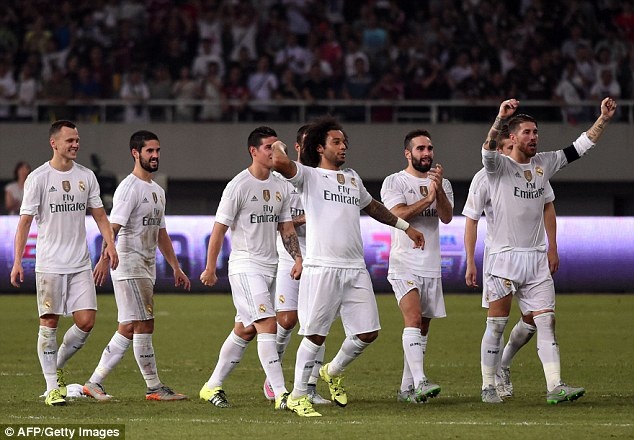 | Các cầu thủ Real Madrid ăn mừng chiến thắng. Chức vô địch ICC 2015 chỉ mang ý nghĩa về tinh thần, giúp thầy trò HLV Benitez thêm hưng phấn trước khi bước vào mùa giải 2015 - 2016. |