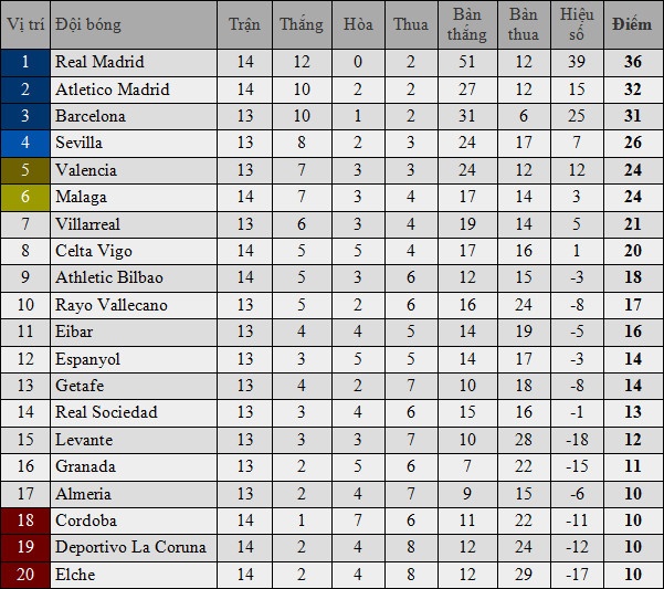 | Bảng xếp hạng La Liga sau loạt trận sớm vòng 14. |