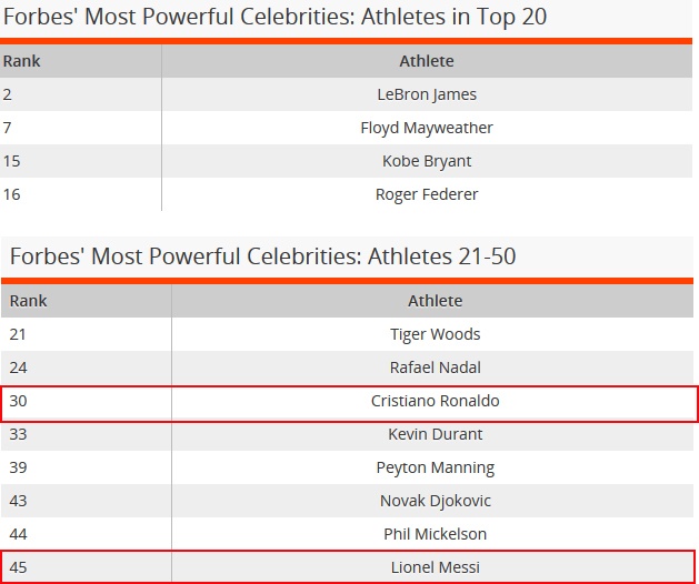 Hai cầu thủ có sức ảnh hưởng nhất tới nền bóng đá thế giới là Cristiano Ronaldo và Lionel Messi cũng góp mặt trong bảng xếp hạng danh giá này. Với thu nhập 80 triệu USD/năm, cùng với danh hiệu Quả bóng vàng 2013, chân sút Real - Ronaldo - đứng ở vị trí thứ 30 trong bảng xếp hạng.