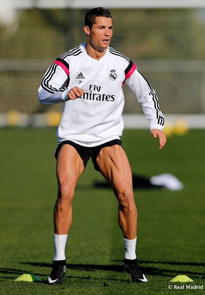 | Trong buổi tập trước trận gặp Celta Vigo tại vòng 14 La Liga 2014/15, Cristiano Ronaldo khiến tất cả phải trầm trổ khi khoe cặp đùi cơ bắp của mình. |