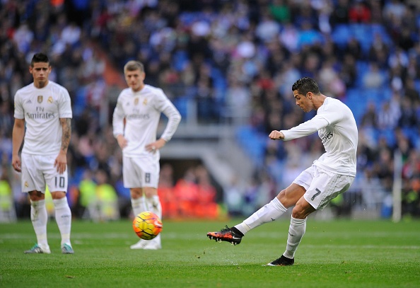 | Ronaldo mới có 3 bàn sau 97 cú sút phạt gần đây. Ấy thế mà anh vẫn giữ khư khư đặc quyền sút phạt, trong khi Real có nhiều chân sút phạt cực lợi hại như chính James và Kroos đang theo dõi. Ảnh: Getty. |