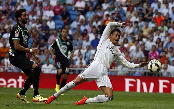 Siêu sao người Bồ Đào Nha rất không hài lòng với quyết định của trọng tài sau khi bị hậu vệ Cordoba đẩy ngã trong vòng cấm trong những phút đầu tiên của hiệp 1.