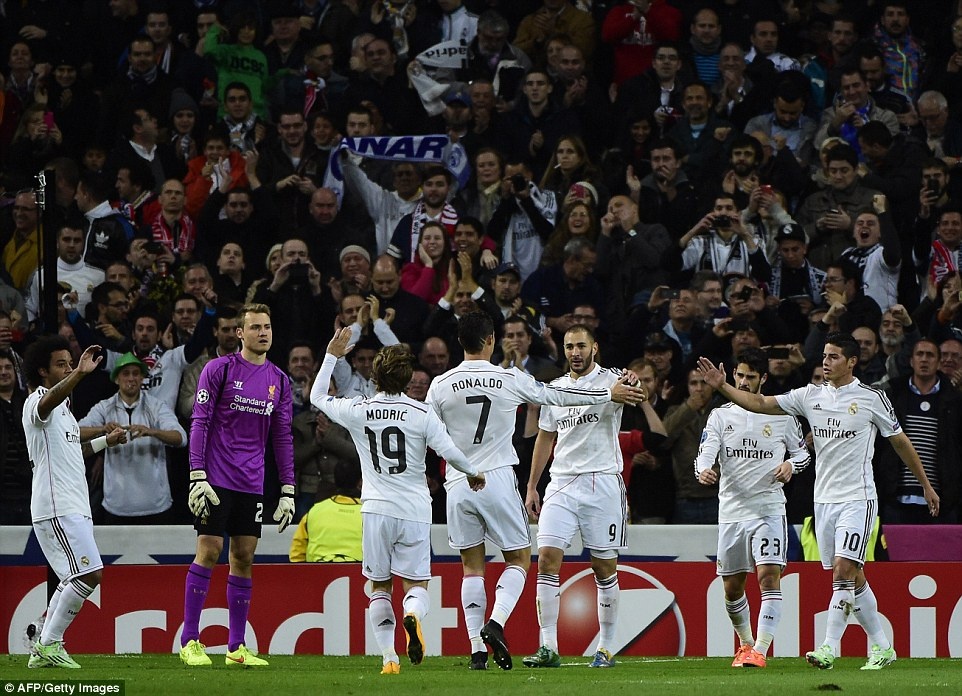 | Dẫu Ronaldo không thể ghi bàn nhưng Real vẫn đạt được mục đích giành trọn 3 điểm. Pha lập công duy nhất của Karim Benzema ở phút 27 sau đường căng ngang tuyệt vời của Marcelo giúp Kền kền trắng toàn thắng sau cả 4 lượt trận và cầm chắc tấm vé vào vòng knock-out. |