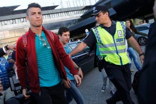 | Ronaldo được cảnh sát tháp tùng rời sân bay. |