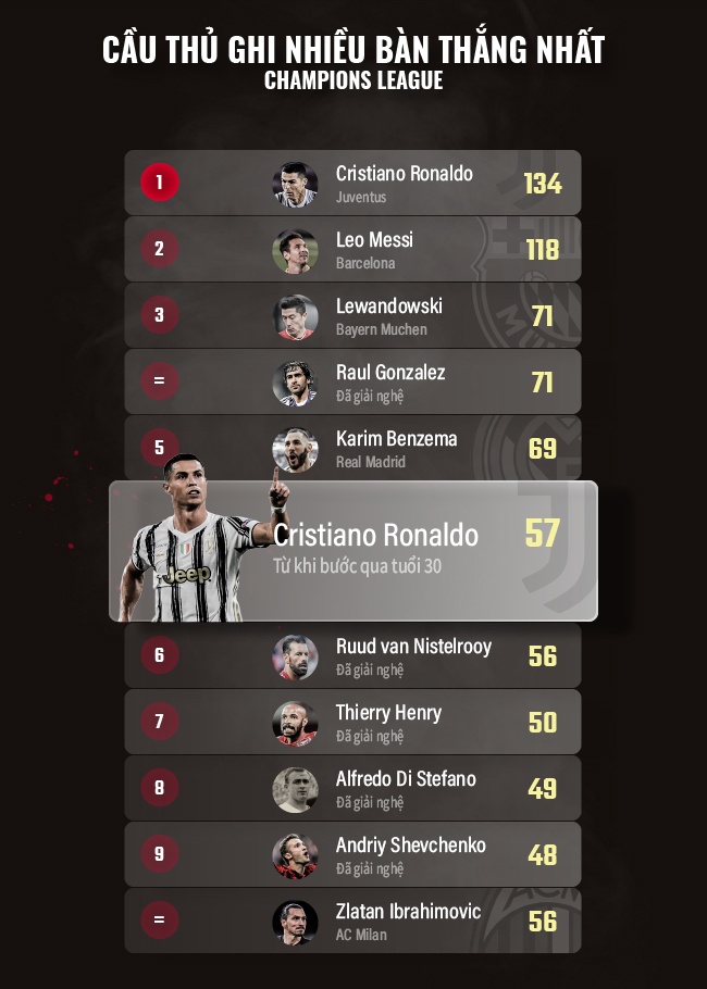 Kể từ khi bước qua tuổi 30, Ronaldo đã ghi tới 57 bàn thắng tại Champions League. Để so sánh, trong cả sự nghiệp thi đấu, Raul Gonzalez chỉ ghi được 71 bàn tại Champions League.