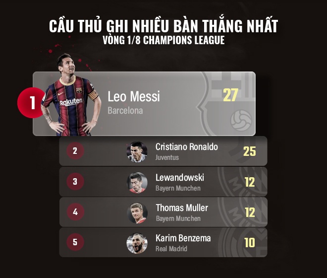 Ở các trận đấu cân não như thế này, Barca vẫn trông chờ vào Messi. Các cổ động viên đội bóng xứ Catalonia có lý do để tin vào Leo. Messi là cầu thủ ghi nhiều bàn nhất ở các vòng 16 đội Champions League với 27 bàn. Ronaldo xếp thứ 2 với 25 bàn.