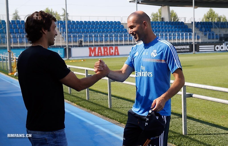 | Raul gặp lại đồng đội cũ Zidane, hiện là Giám đốc thể thao và trợ lý HLV ở CLB Hoàng gia. |